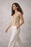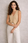 The Eleanor vest is crafted from a soft viscose-rich blend with delicate hollow-out trim and buttoned front for effortless boho charm. Its sleeveless silhouette and relaxed fit offer timeless layering — ideal for transitional seasons and casual elegance where airy sophistication meets everyday comfort.
